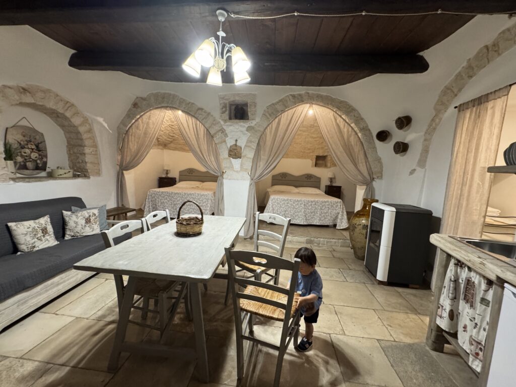 「Trulli(トゥルッリ)」の中は、こんな風に通常の生活ができるようになっていました。キッチンもついていて自炊もできます。が・・・