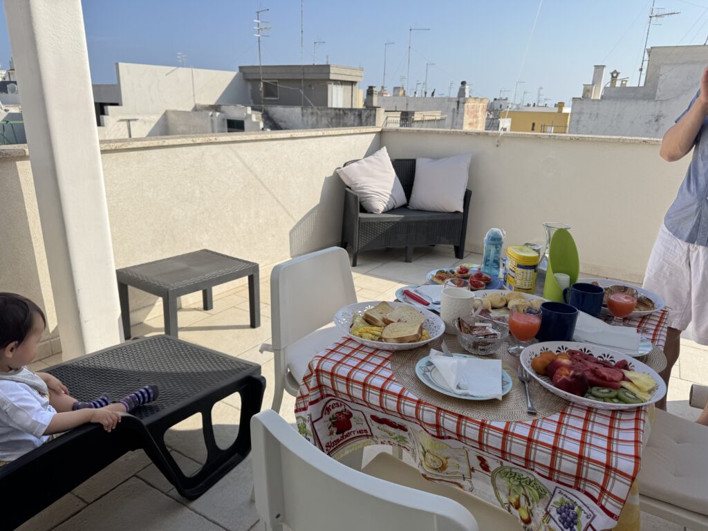 南イタリア最終日の朝です。朝食は、オーナーさんがわざわざ作って、朝にお部屋まで運んでくれ、更に屋上のテラスに設置してくれました。
