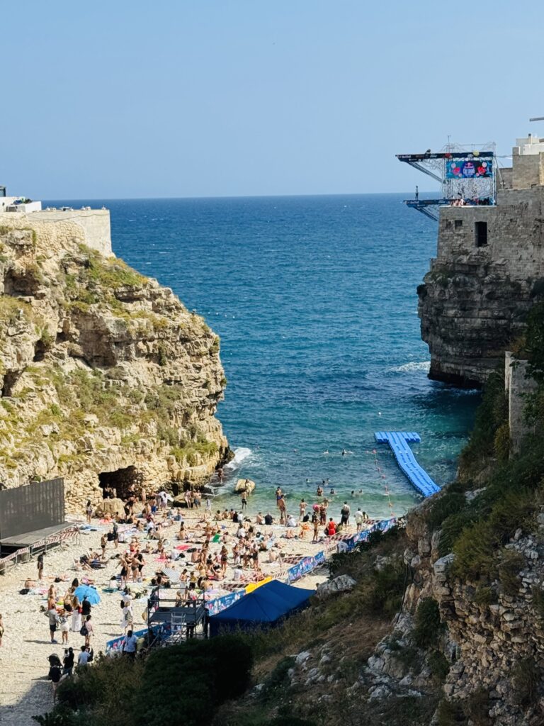 とてもいいお天気だったので、朝食の後はまた海岸沿いを見に行きました。すると、飛び込みの大会?みたいなのが行われていて崖の上に人がいましたよ!この高さから飛び込むなんて凄いですよね・・・私にはできない・・・