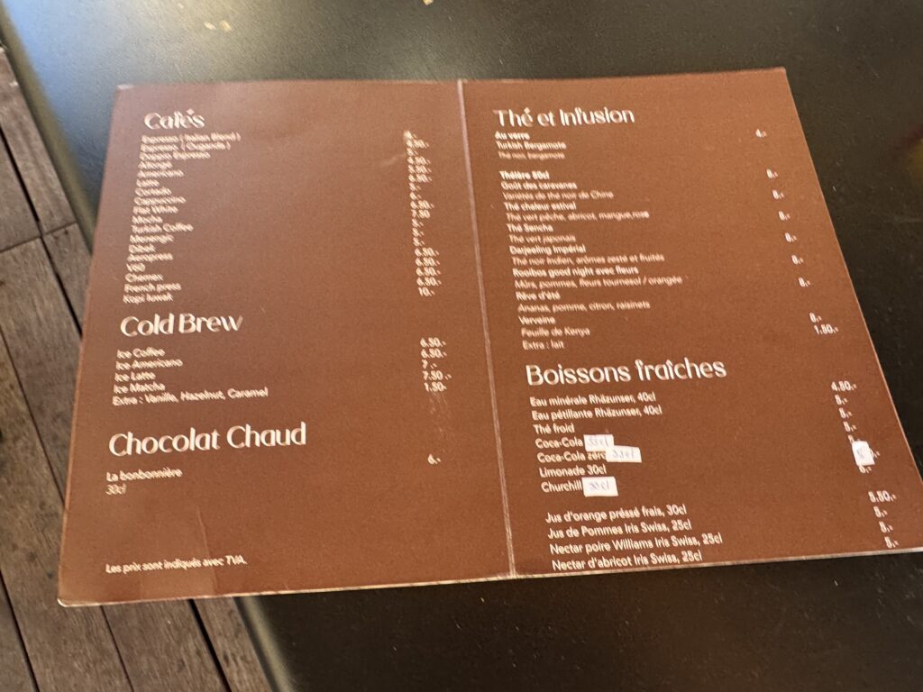 ここでは持ち帰りの場合クロワッサンとコーヒーで5フランという衝撃のメニューを提供してくれています。が、今回はカフェ利用だったのでそちらは頼まず食べたいもの、飲みたいものをオーダーしました。