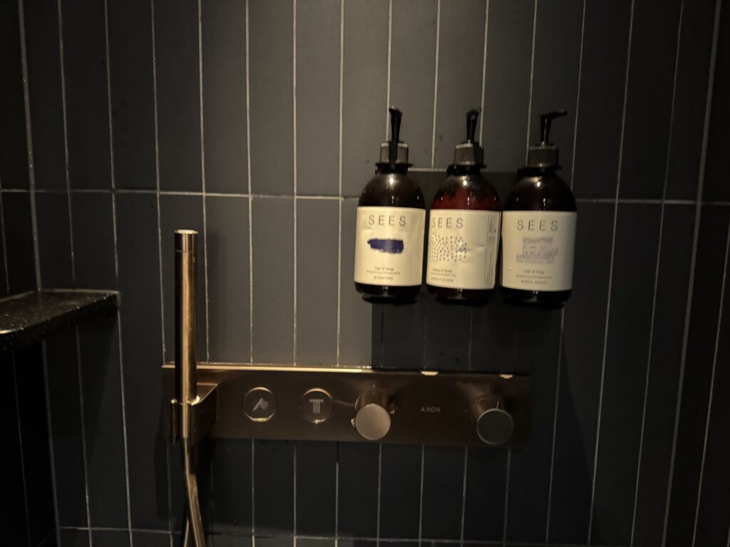 シャワールームでにはシャンプー、コンディショナー、ボディーソープが揃っていました。しかも、シャワーと上から降ってくる修行タイプのシャワーがボタン一つで切り替えできるという神仕様のシャワールームです!