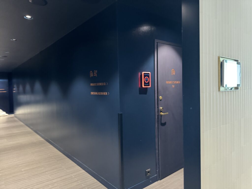 予約制ではなく、開いていたら誰でも利用できます。開いている合図はドアの前のパネルが青の場合です。写真だと赤なので使えませんね。