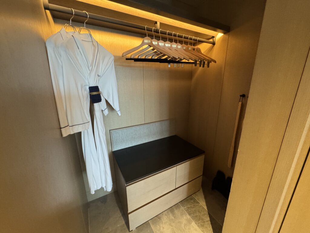クローゼットにはたくさんのハンガーとまるで着物のようなバスローブが用意されています。
