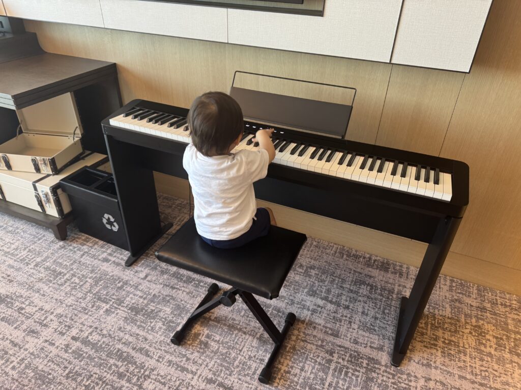 なんと全客室にピアノが設置されているんです。ホテルのオーナーさんが音楽とアートが趣味の方らしく、コンセプトとして全客室にピアノを置いちゃったらしいのです。実際に弾くこともでき、息子は興味津々で弾いていましたよ。