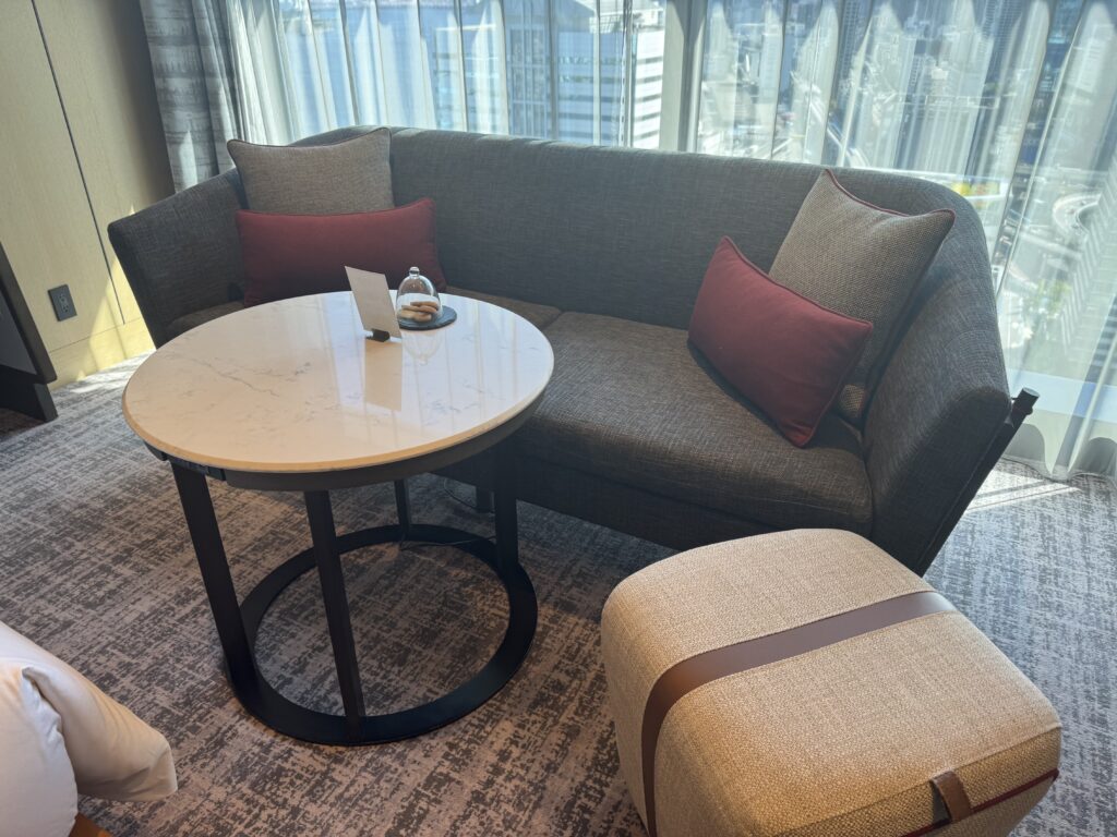 奥にはミニテーブルとソファがあり、テーブルの上にはウェルカムスイーツが置かれていました。