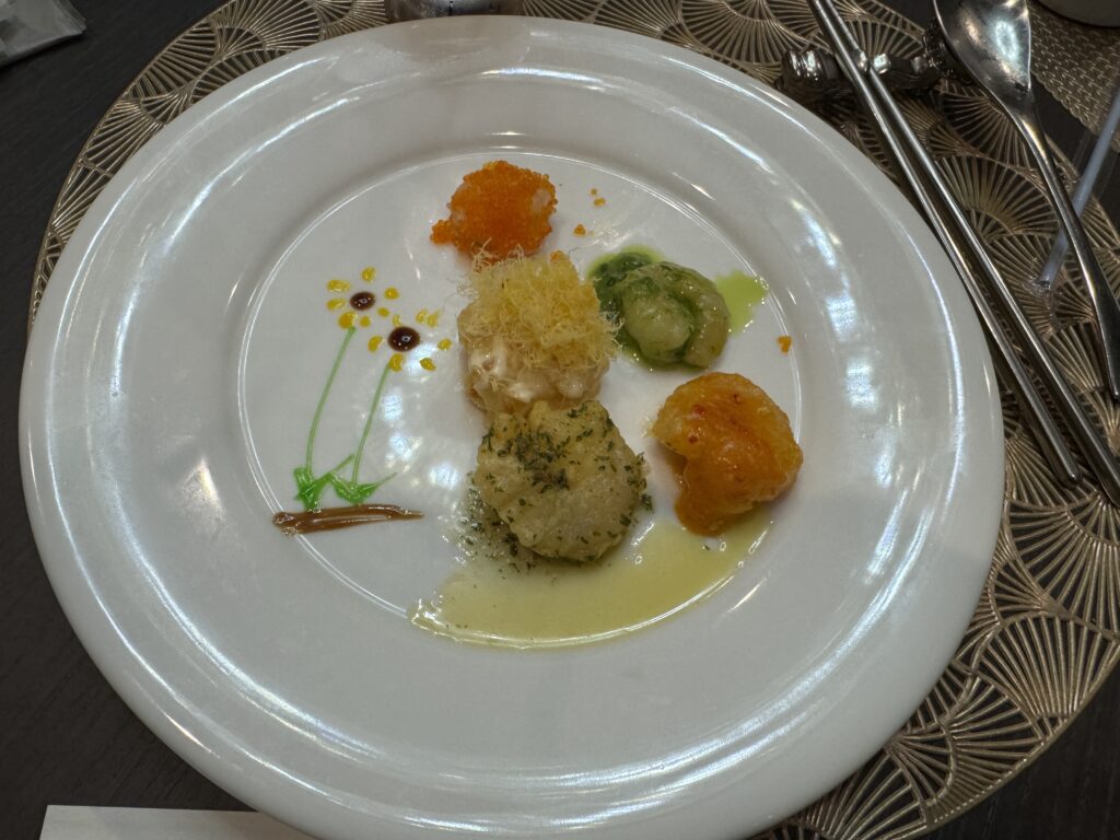 まずは前菜盛り合わせが運ばれてきました。5種類の食材が乗った前菜で、それぞれ違った味付けがしてあり、どれも美味しかったです。