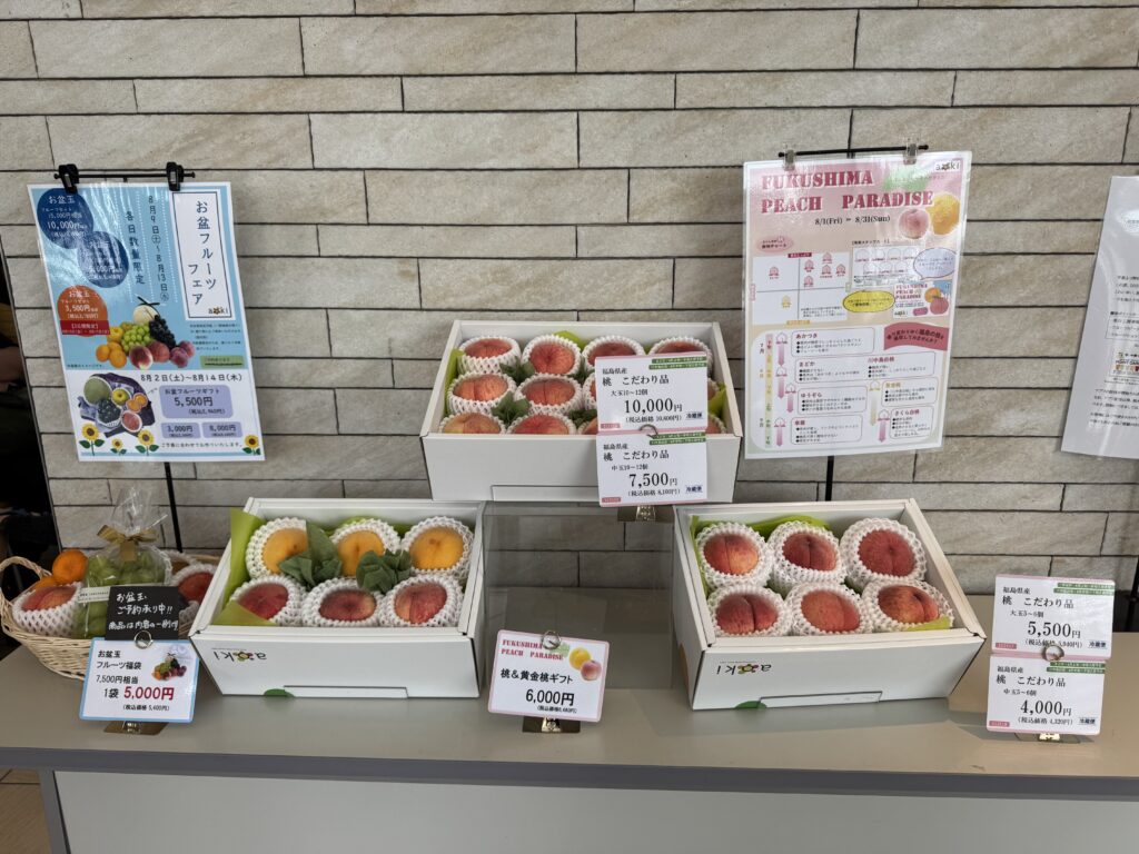 8月にお店へ行ったので、メインエントランスには旬の桃が並んでいました。