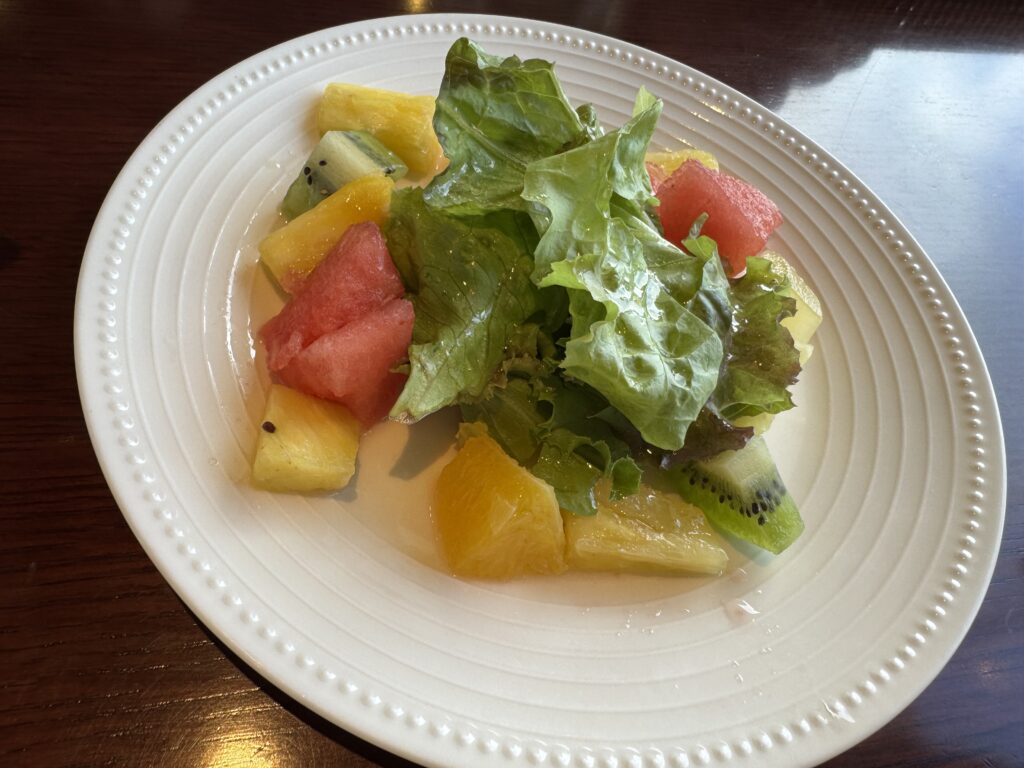 また、様々なフルーツが入ったサラダもつきます。こんなにフルーツが盛りだくさんなサラダがついてくるなんて贅沢ですよね!