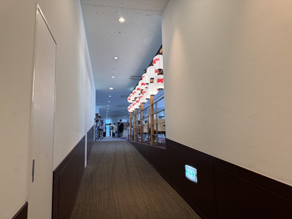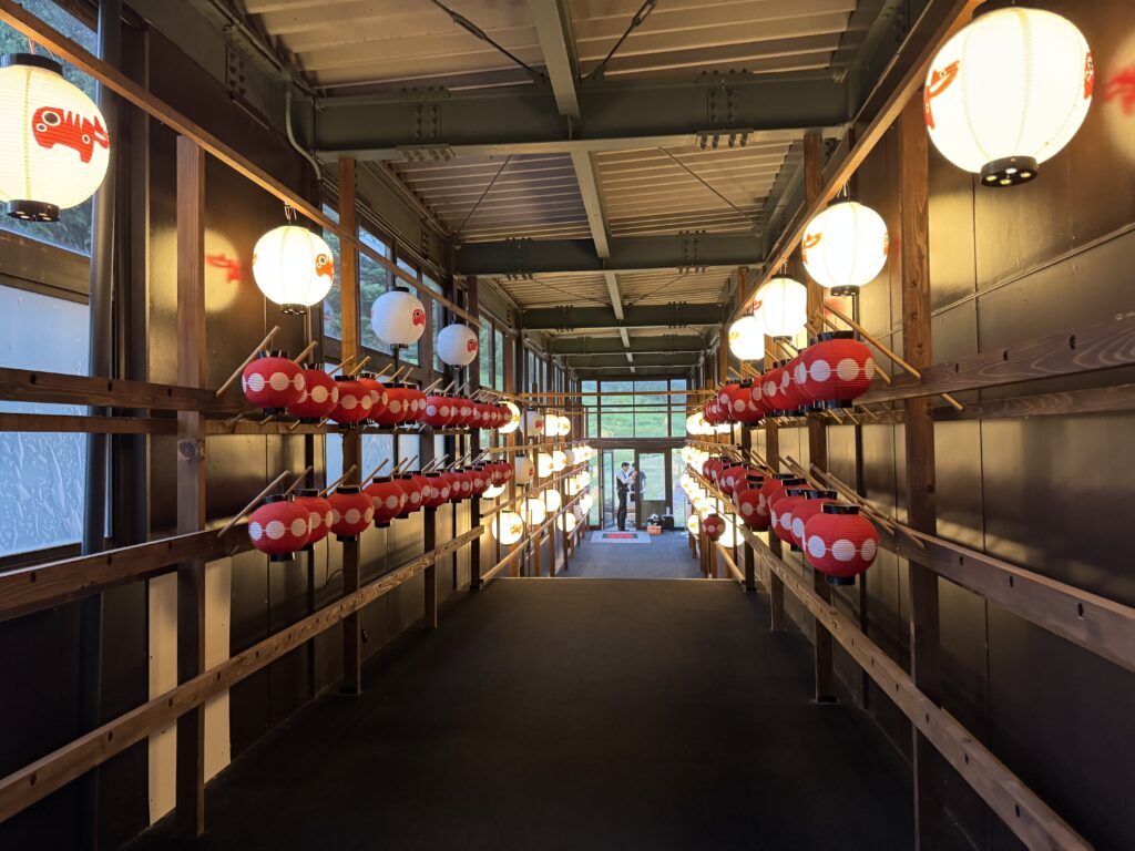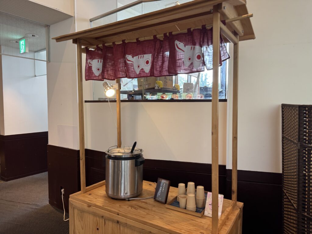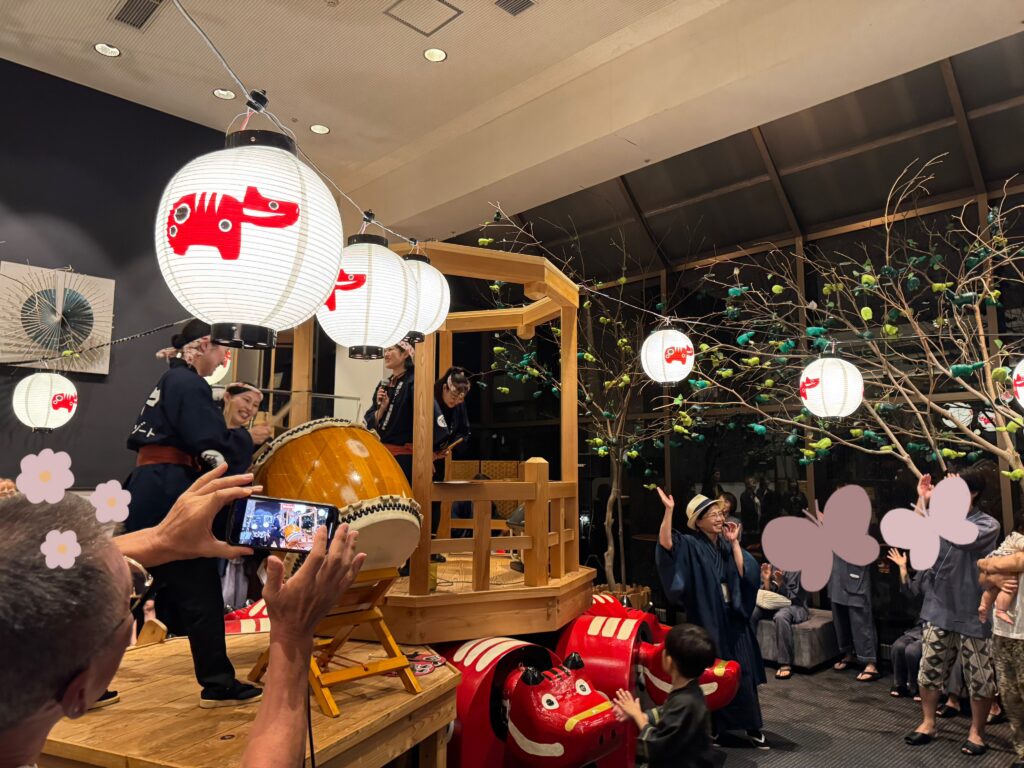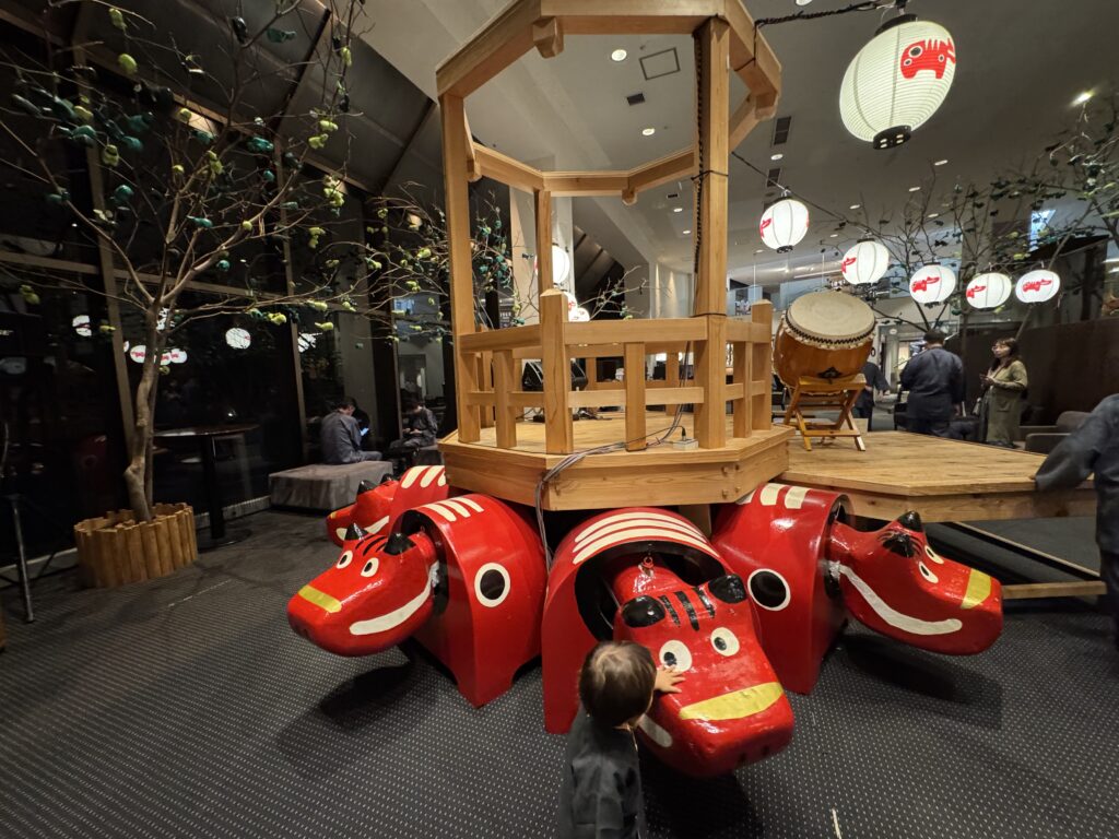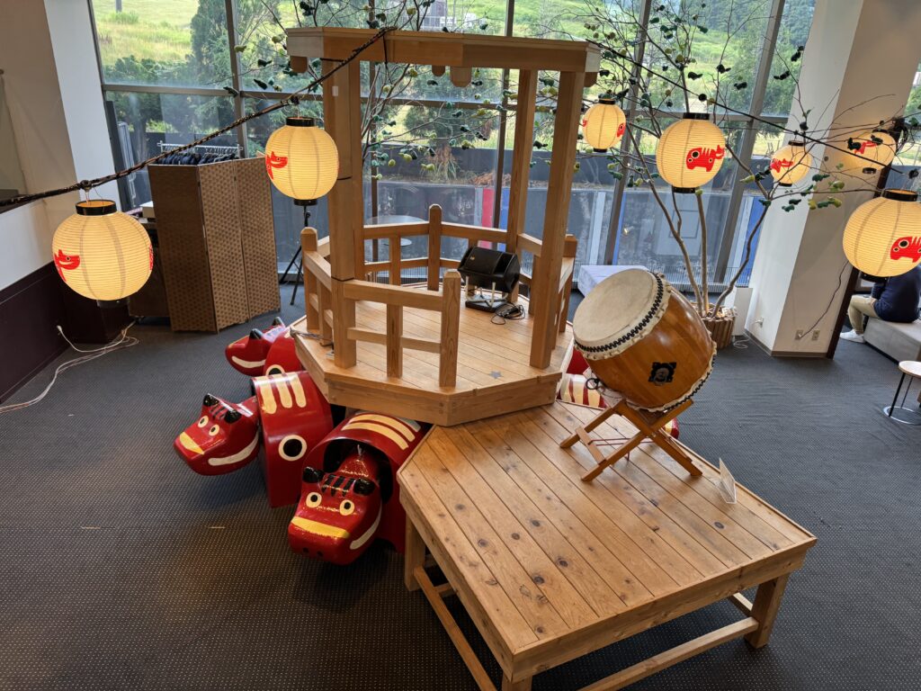 ラウンジには、赤ベコが設置されたお祭り台や和太鼓が置いてありました。