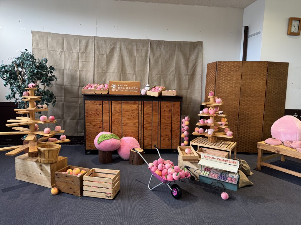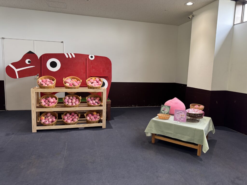 桃写真スポットがあり、子どもたちは楽しそうにしていました。