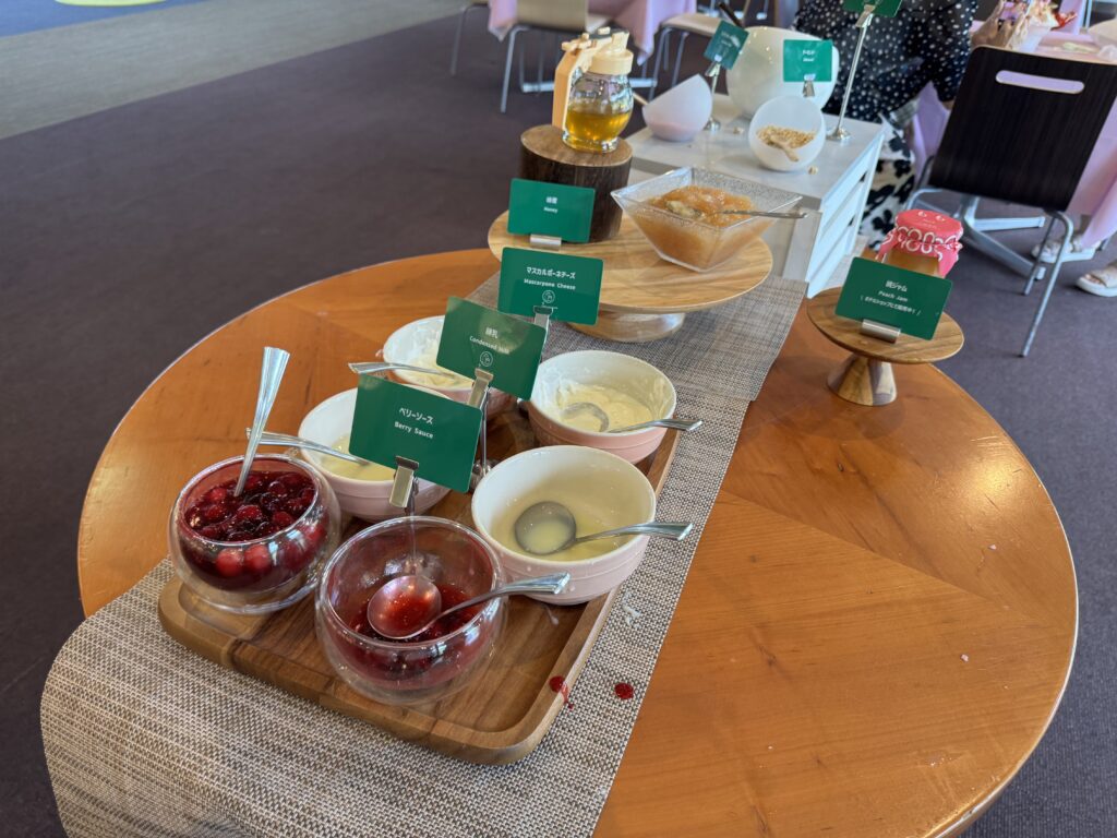 桃ソースの他にも、ベリーソースやマスカルポーネチーズ、練乳などのトッピングも用意されていました。