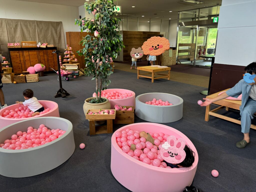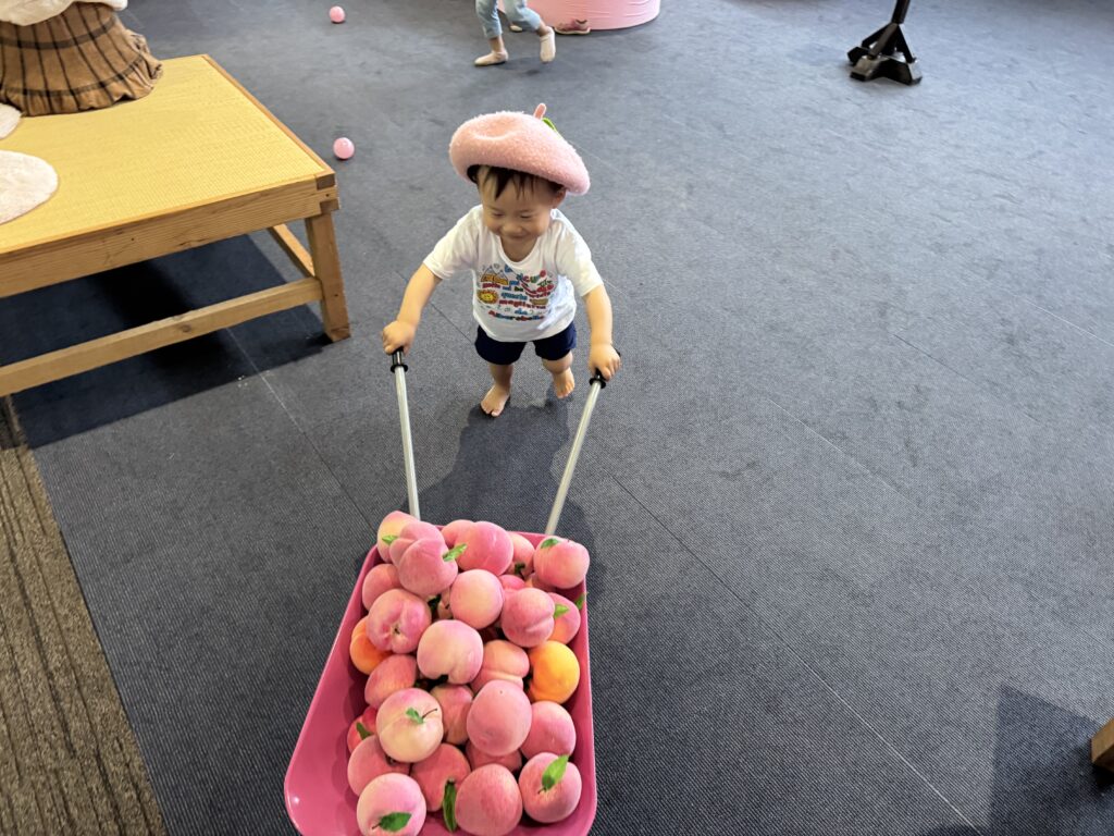 子どもたちが遊べるスペースへ行きました。ここでは桃のボール投げや、