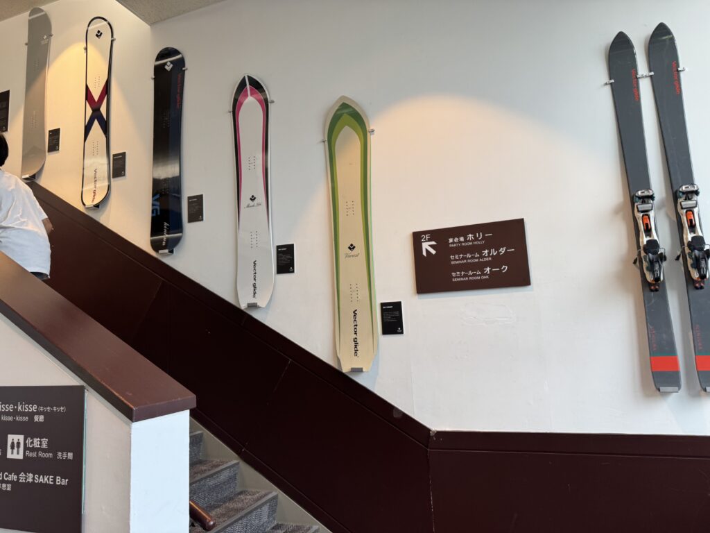 またフロントへ戻り、今度はスキー板が並ぶ階段を登ってみました。
