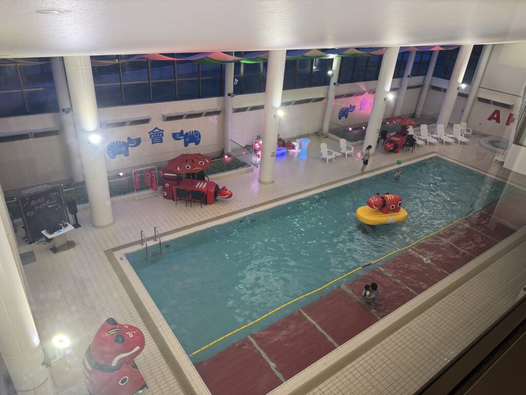 他にも室内プールなんかもあって、夜もプールで遊べるようになっていました。赤ベコたくさんで可愛いプールですね。