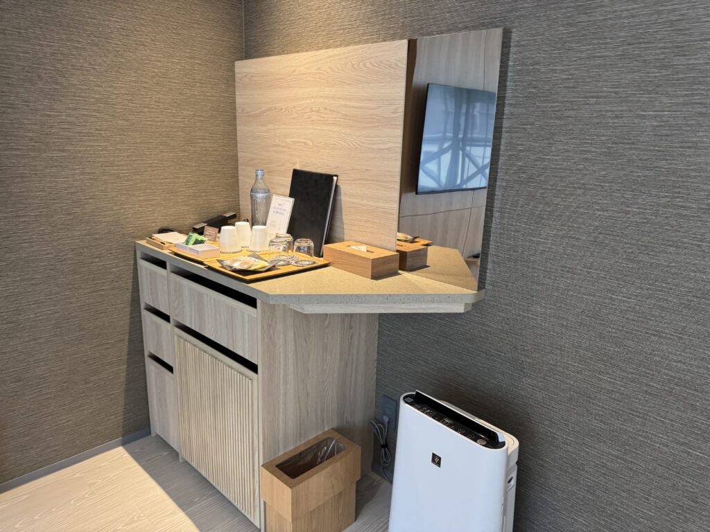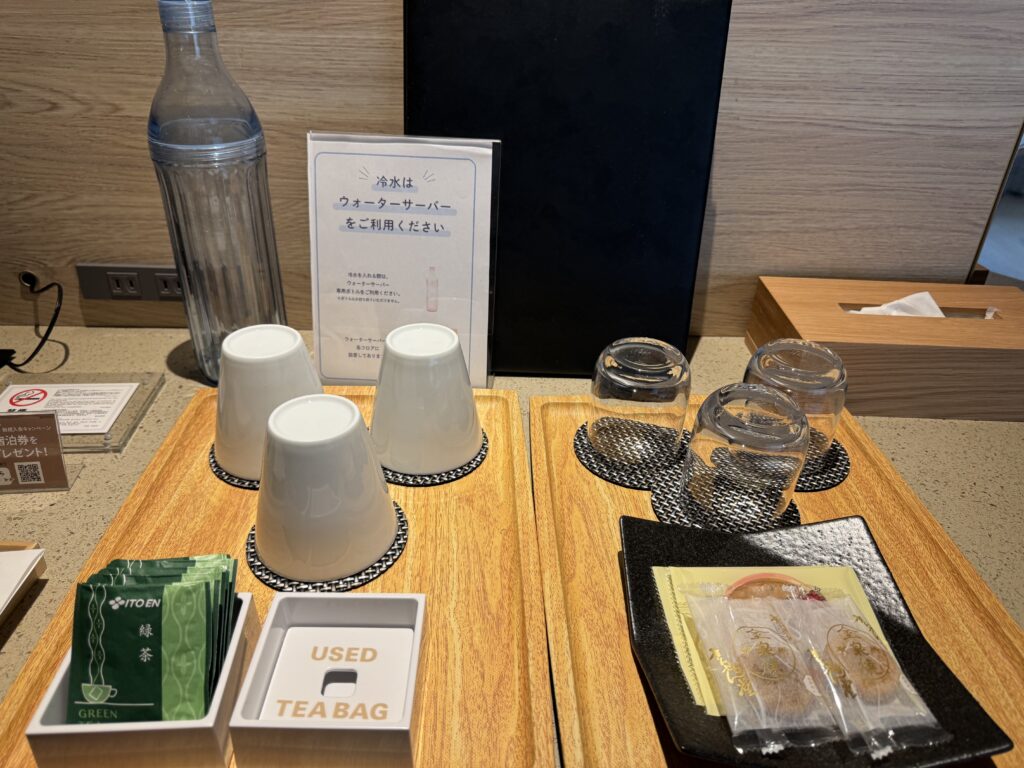 お茶やお菓子が置いてありました。お水は空の専用ボトルが置いてあり、エレベーター前にあるサーバーでセルフで汲んでくるようになっていました。エコでいいですね。