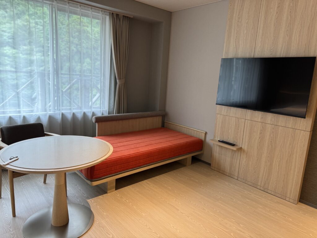 ソファベッドにもなりそうな椅子やミニテーブル、テレビがスッキリと配置されています。