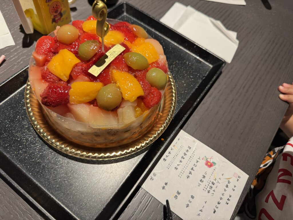 フルーツたっぷりのケーキでとても美味しかったです。このケーキはホテルのHPからオンライン申し込みができたのですが、ホテル側で用意してもらえるのは助かりますよね♪