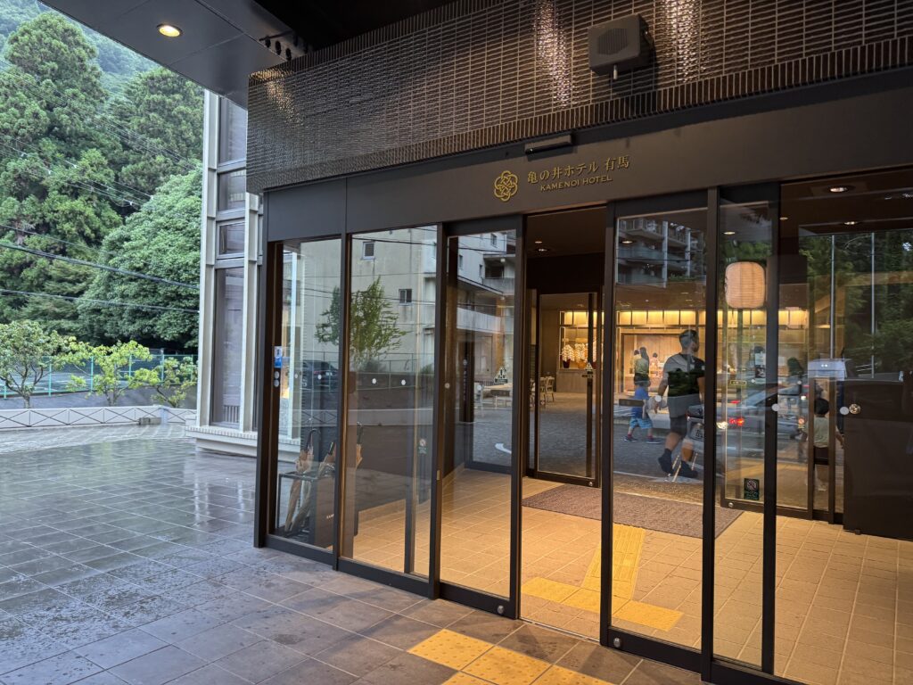 「亀の井ホテル 有馬」は、たくさんの温泉宿が立ち並ぶ地域にあります。窓張りが美しい外観で、車寄せもあって、荷物の積み下ろしや子供たちを安全に館内へ移動するのに楽でした。