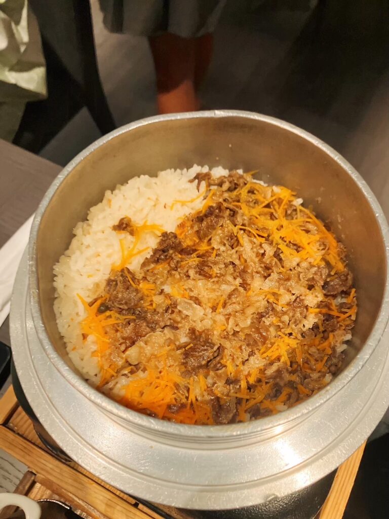 更に神戸牛尽くしは続き・・・今度は神戸牛時雨釜飯です。炊きたての土鍋を席まで持ってきてくれ、その場で混ぜてくれました。