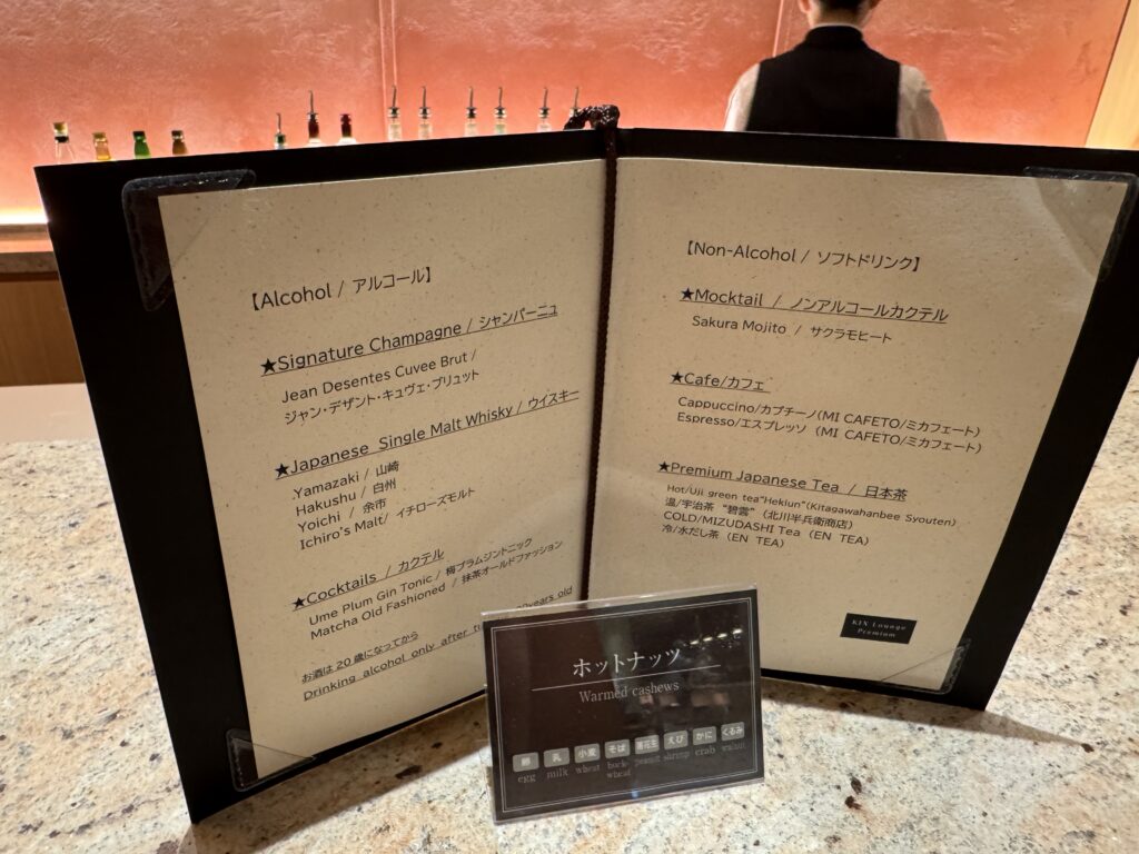 ここでは、シャンパンやヤマザキを含むウイスキー(ヴィンテージ不明)、カクテルや様々な飲み物を提供してもらえます。