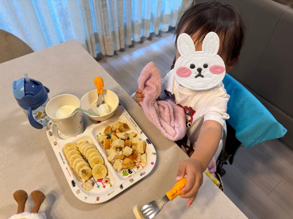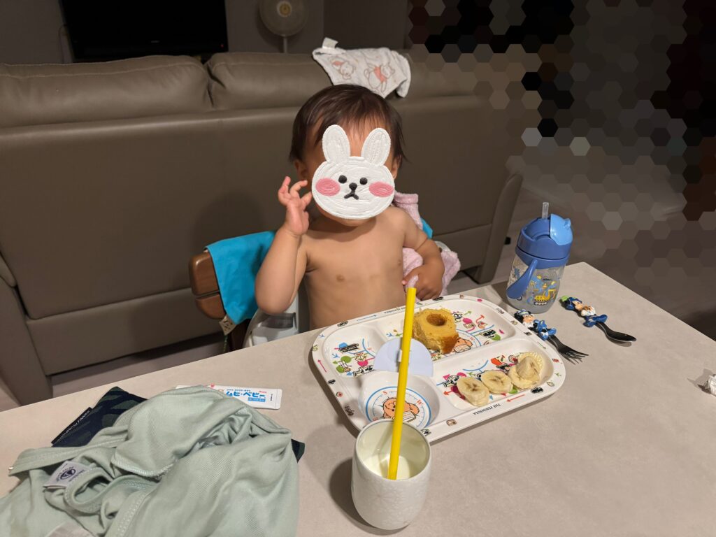 「ご飯を食べる」というので、買っておいたバームクーヘン、バナナ、牛乳を用意しました。夏の日本は深夜でも暑く、深夜に裸でスイーツを食べる2歳児の爆誕です(笑)