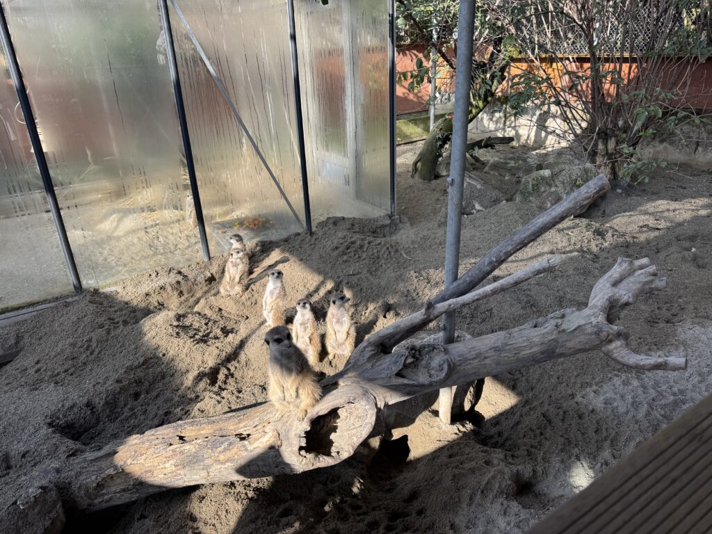 檻を出ると、可愛いミーアキャットがたくさんいました。みんな立ってこちらを見ていてなんだか面白かったです。