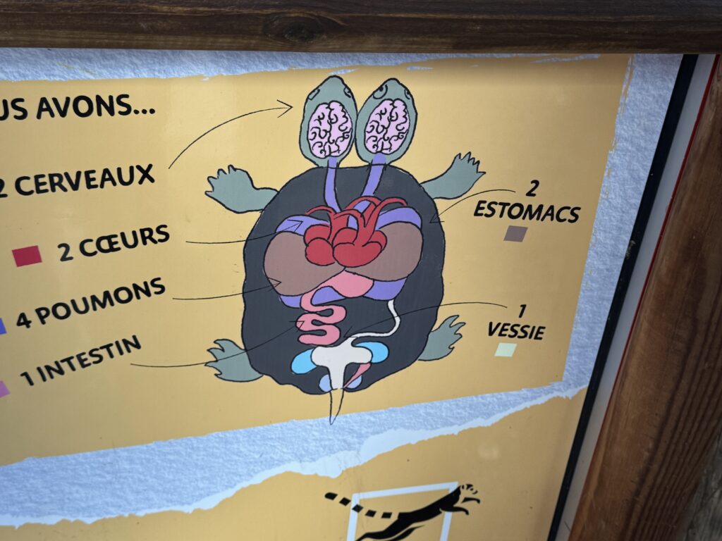 どうやら、一体で2つの頭、2つの心臓を持つ亀のようです。このような亀さんは非常に稀で、野生では生存率が低いとされているそうですが、ジュネーブにいる「Janus(ギリシャリクガメ)」は二頭性の個体としてかなりの長寿記録を持つ亀さんのようです。
