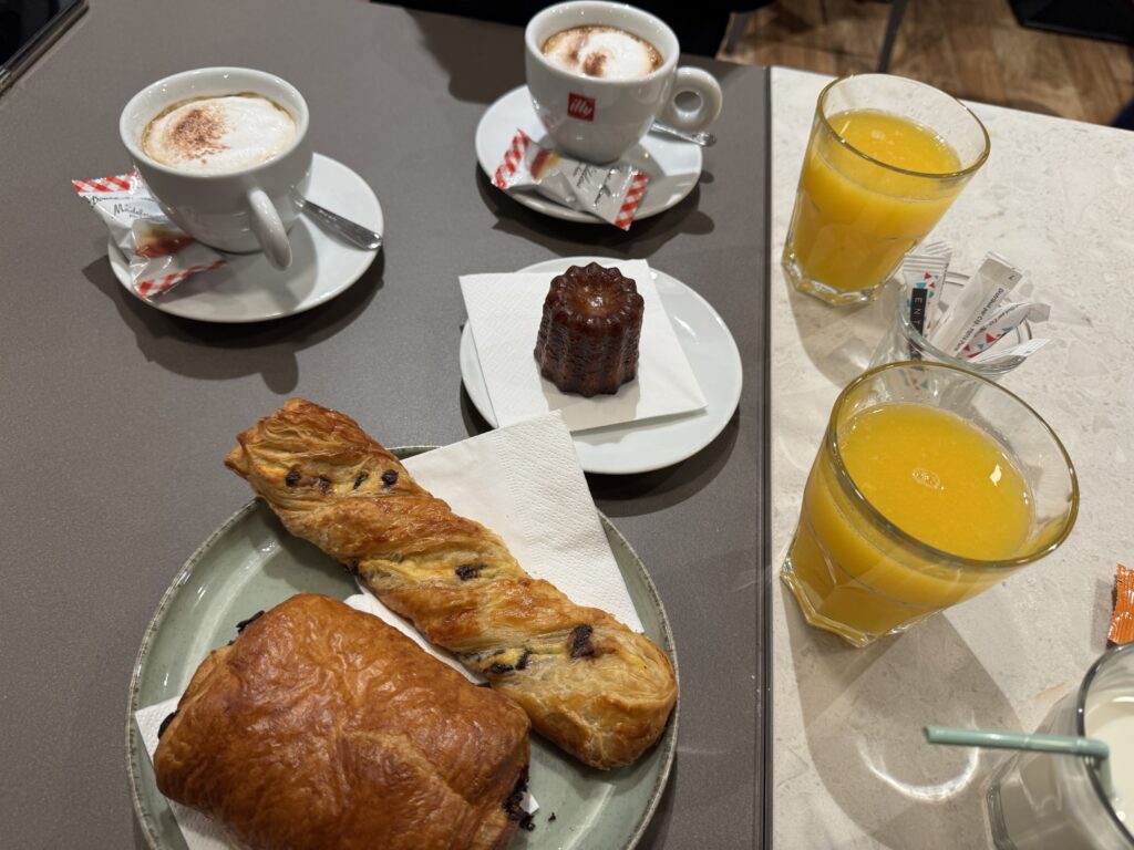 オレンジジュース、カプチーノ、パンオショコラとねじねじのチョコパンです。カヌレは追加しました。