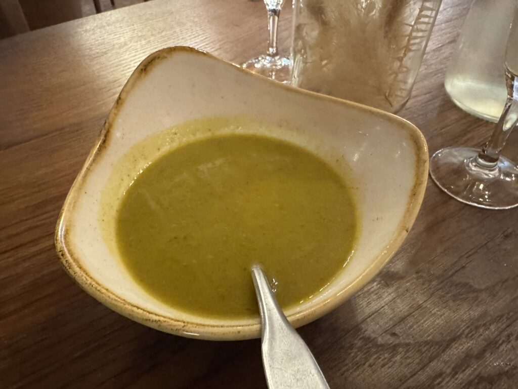 前菜でソーセージかポタージュから選べたのでポタージュにしましたよ。野菜と豆のポタージュとのことで健康的な味でした。