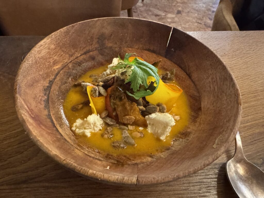 主人の前菜は、様々なかぼちゃを使った一皿です。かぼちゃのローストや、ソース、クリームなど様々な形にアレンジしており、秋を感じることができました。