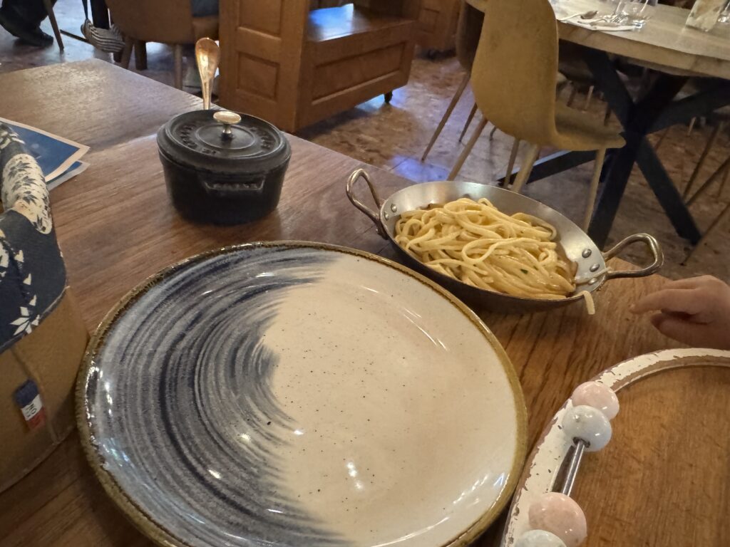 続けて、キッズメニューのメインです。メインにはボロネーゼパスタを選びました。写真でわかりにくいのですが、銀のフライパンには太めのパスタ、そして小さなココットの中にボロネーゼが別添えで提供されました。本格的なパスタで私達のほうがびっくりでしたよ!しかも、美味しかったです。
