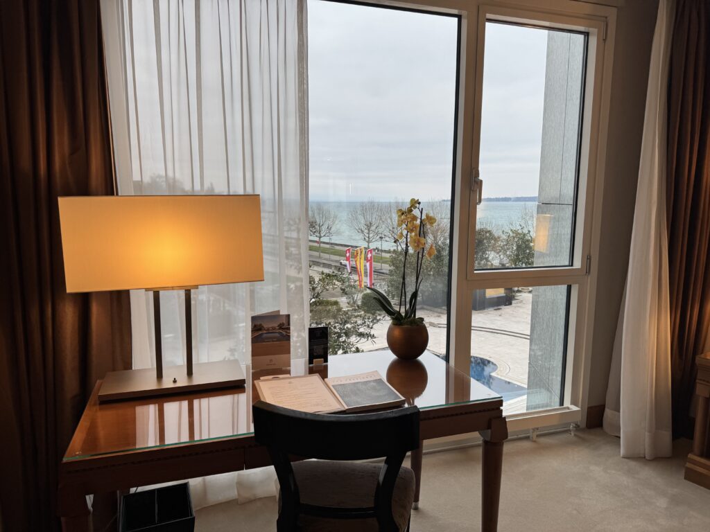窓辺はレマン湖を見渡せるデスクがあります。窓から外を眺めてみると・・・