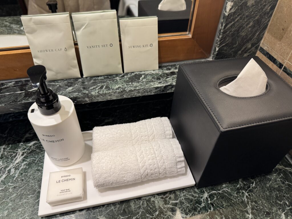 アメニティーは、シャワーキャップ、コットン、綿棒、石鹸、スリッパで、歯ブラシやコームはありませんでした。