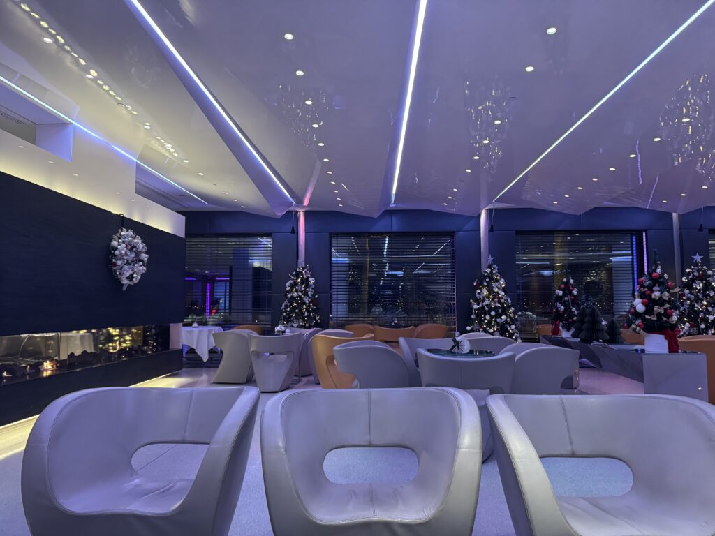 照明がムーディーに落とされたソファー席・・・ツリーもたくさんあってクリスマスのムード満載でした。