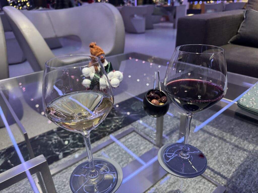ワインかビールから選べたので、スイスの白ワインと赤ワインで乾杯しました。素敵なバーで飲むワインは格別でした。