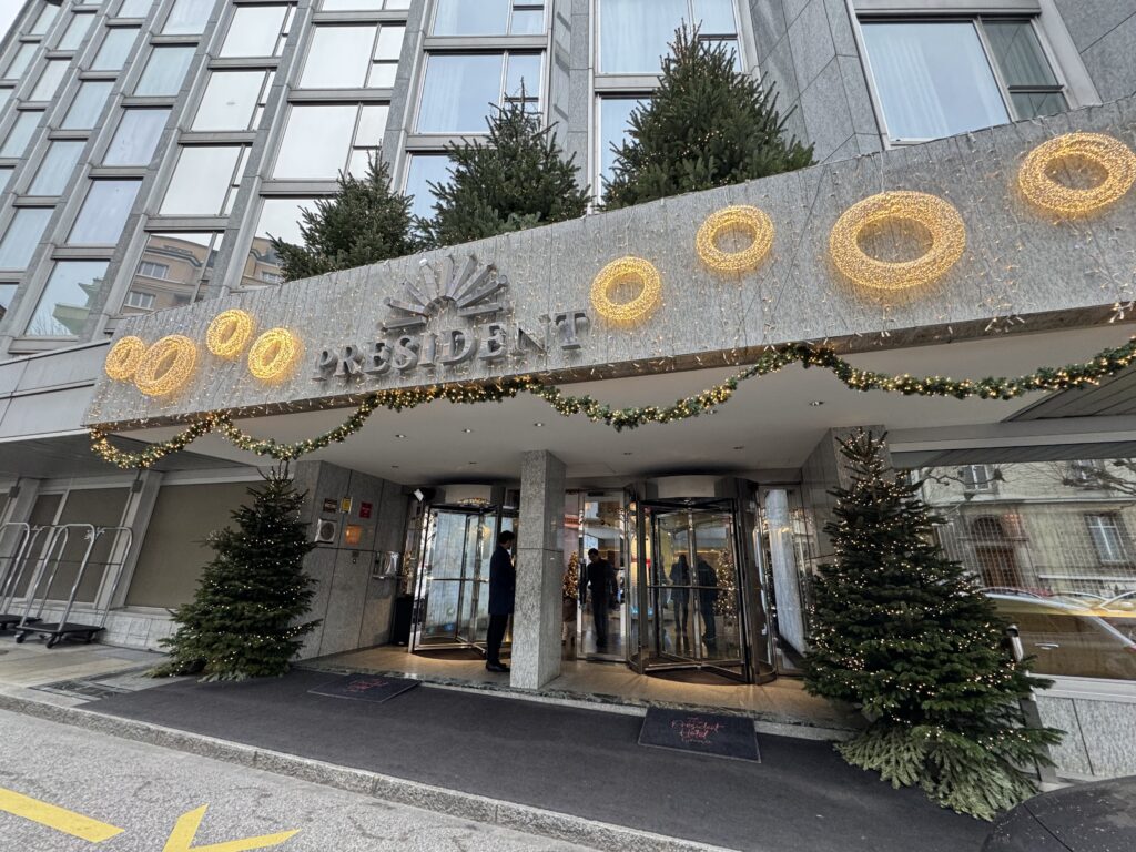 こちらが、「Hotel President Wilson, a Luxury Collection Hotel, Geneva」の外観です。冬のスイスはお空がどよ〜んとしていて映えないのですが、ホテルロゴにはテンションがあがりました。