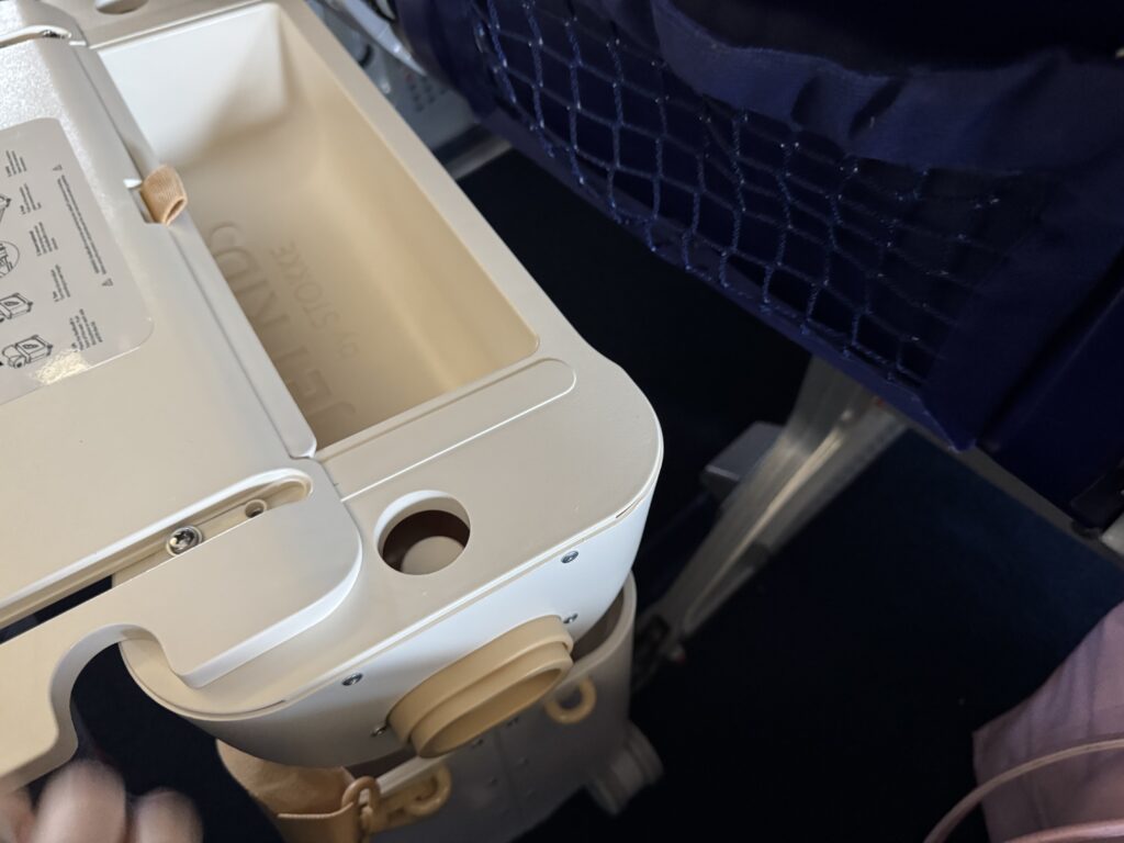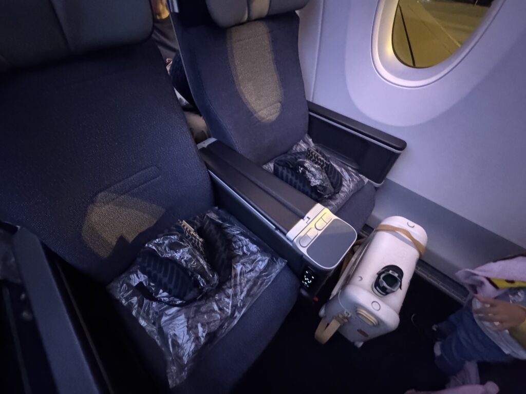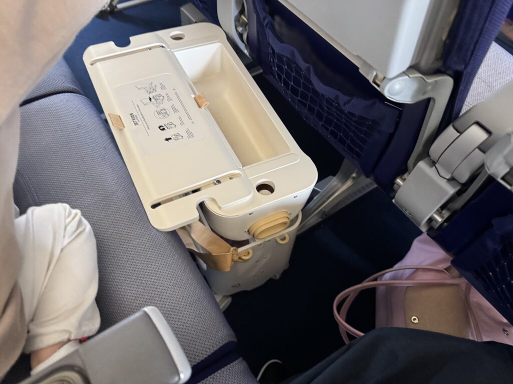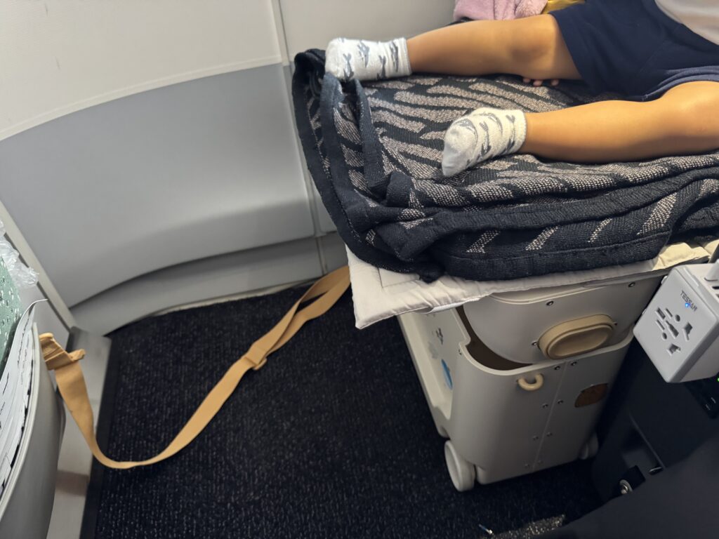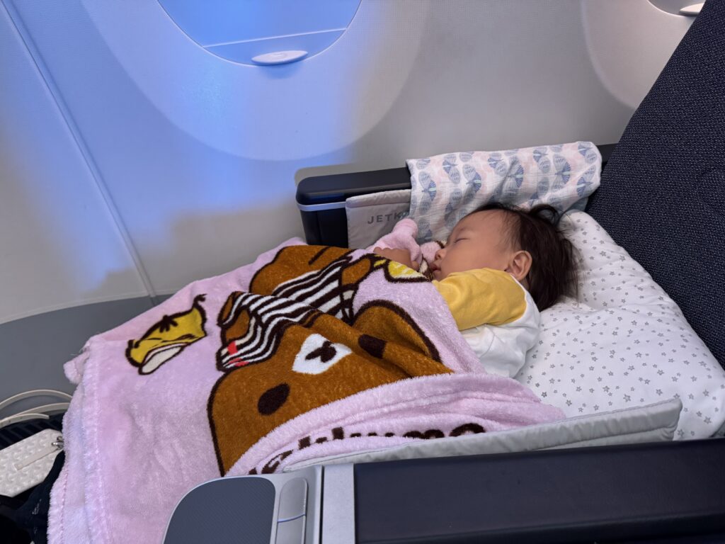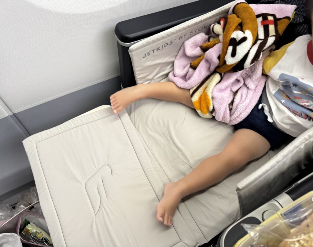 結局、寝る時は自分の座席と私の座席を半分使って寝てしまい、「JETKIDS」は使いませんでした(泣)(隣の方の方にはみ出ないように、私の方に寄ってもらっています)