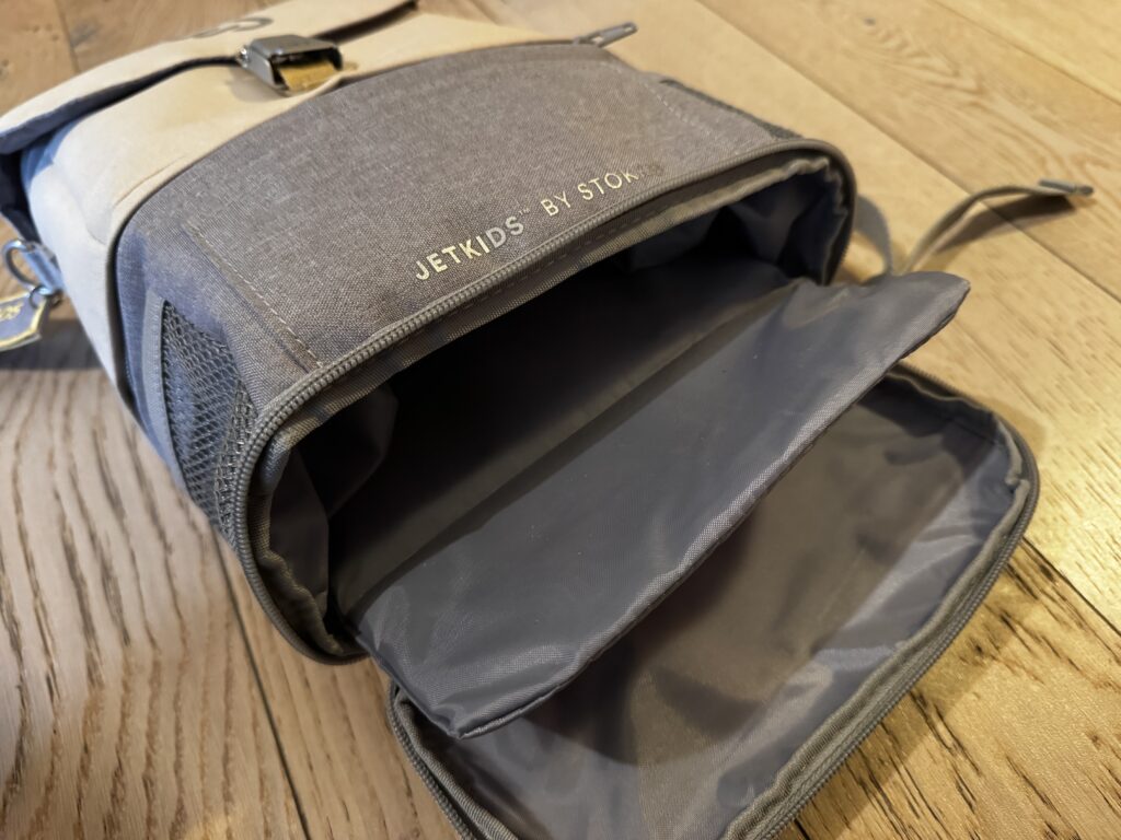 ファスナーを開けると、ガバッと口が開きます。背の部分には柔らかい素材の板のようなものが入っているので、ここにはシールや何処かでもらった塗り絵の紙や、フライトチケットなどが折れずに収納できます。