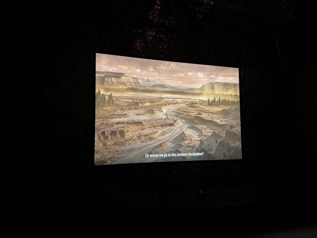 まず最初のお部屋に入ると、映画館のようになっていました。スクリーンには恐竜の歴史などが説明されたショート映画が放映されていました。私はこれを見たかったんですけどね、それよりも早く恐竜に会いたい人がいたので、このお部屋は2秒くらいで出る羽目に・・・