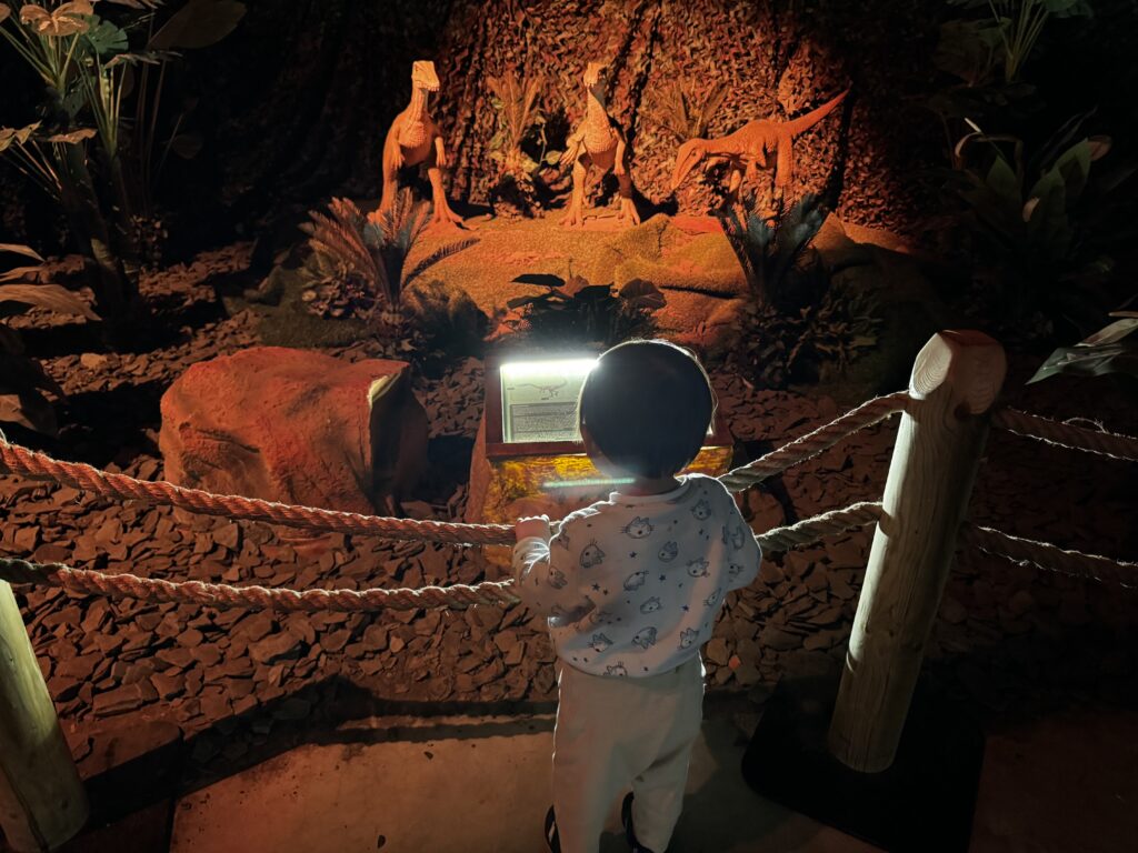 照明は暗めで、雰囲気も出てきます。知らない恐竜がたくさんいるなあと思いながらみていたのですが、このお部屋は古代の恐竜だけを集めた場所で、みんながよく知る恐竜のもっと前に生きていた恐竜達だったんですって。