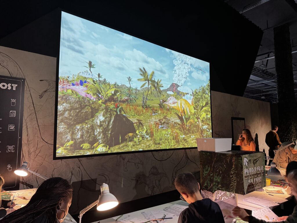こちらは、塗り絵コーナーです。恐竜に塗り絵をして専用の機械に読み込ませると、自分が塗った恐竜が画面上に出現するというものでした。