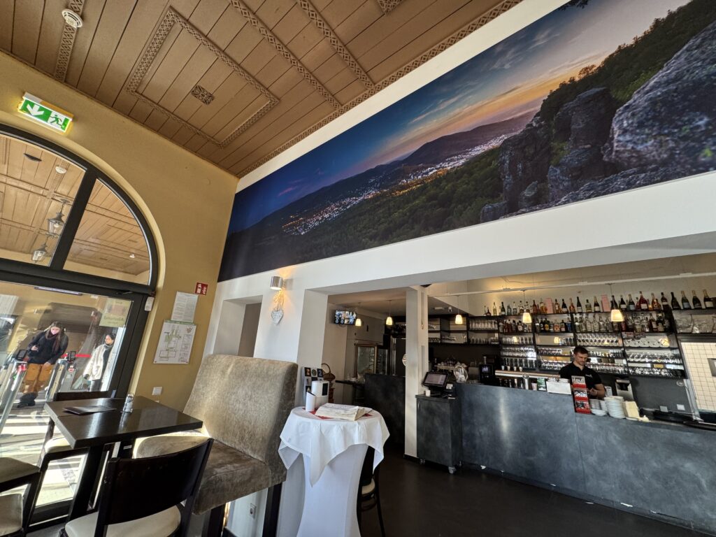 店内には、黒い森の写真が貼ってあり、山の上のカフェというか、スキー場のカフェみたいな雰囲気でした。でもとっても暖かくて助かりました。