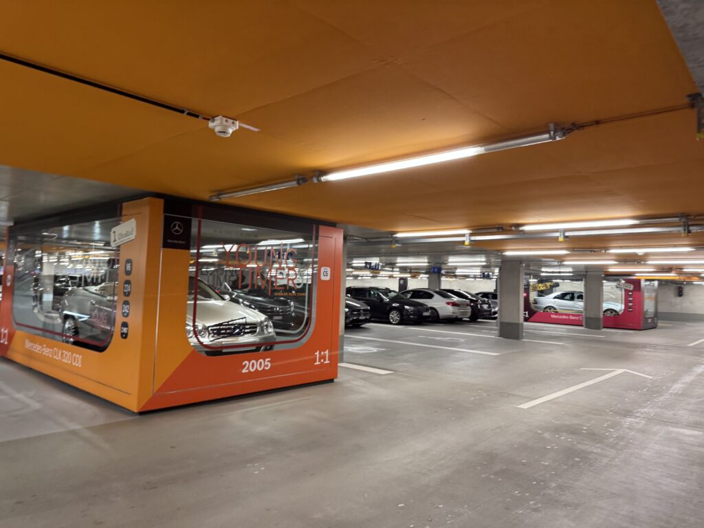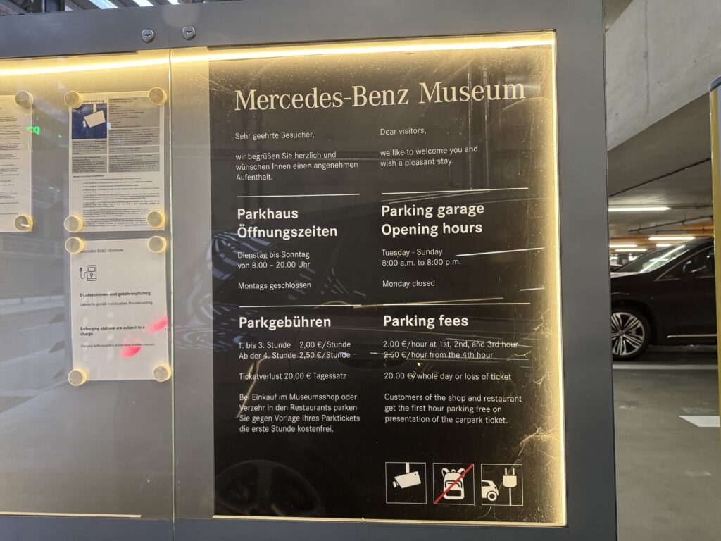 駐車場には、車を停めるスペースに写真のようにベンツの車が展示されていました。駐車場から展示が始まっているなんてびっくりですよね!?