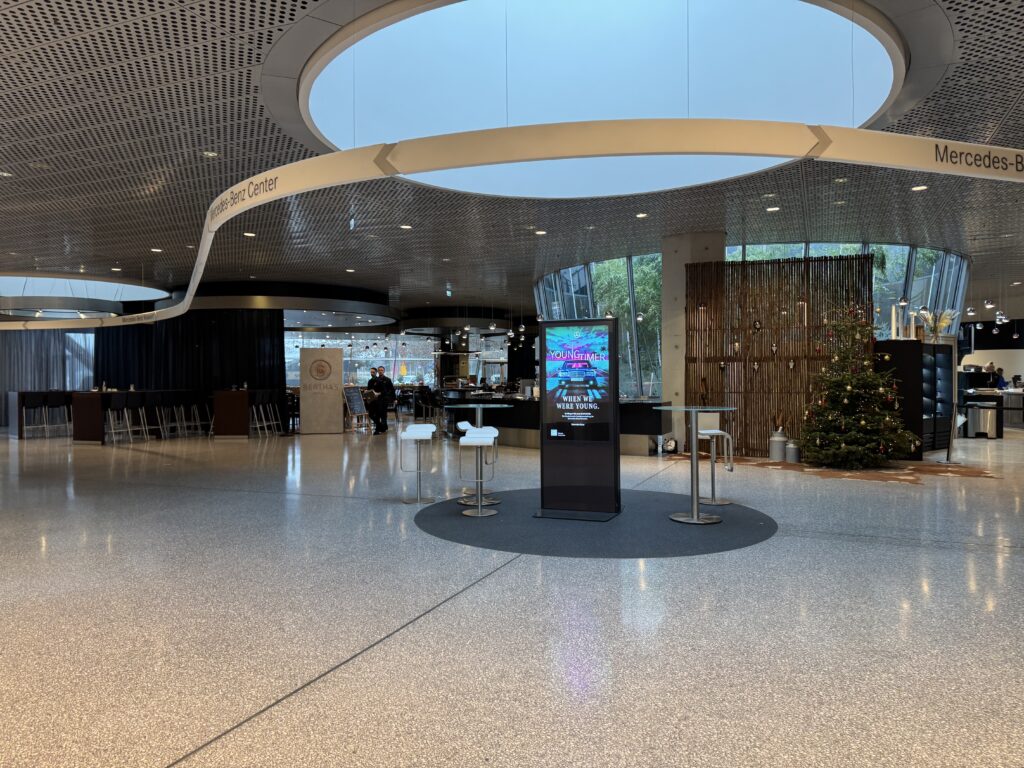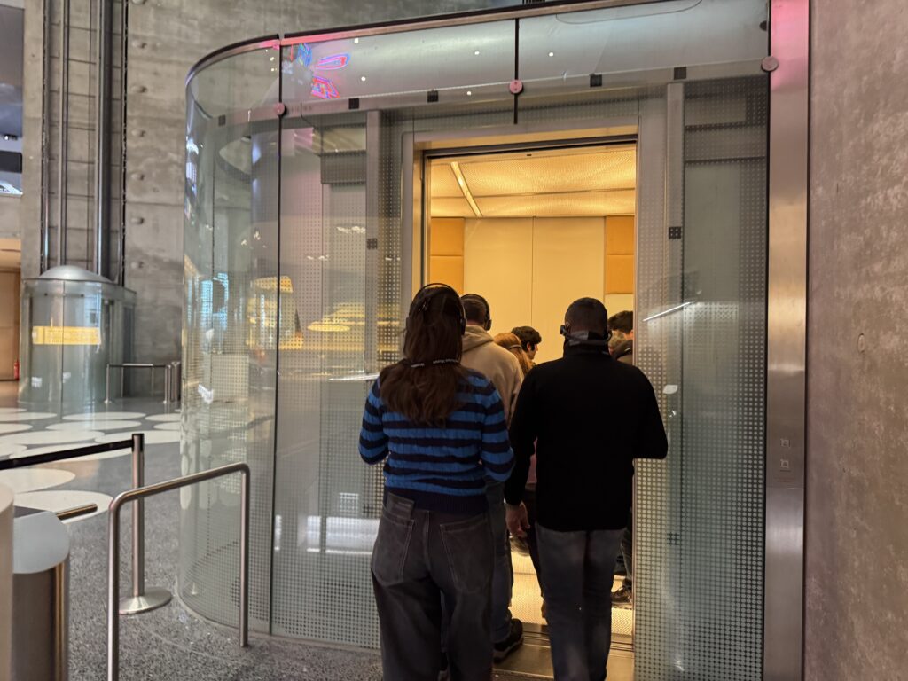 エレベーターの中は結構ぎゅうぎゅうだったので、外の景色を楽しむ余裕はなかったのですが、みんな笑顔でこれから見ることができるベンツの展示物にワクワクしているようでした。