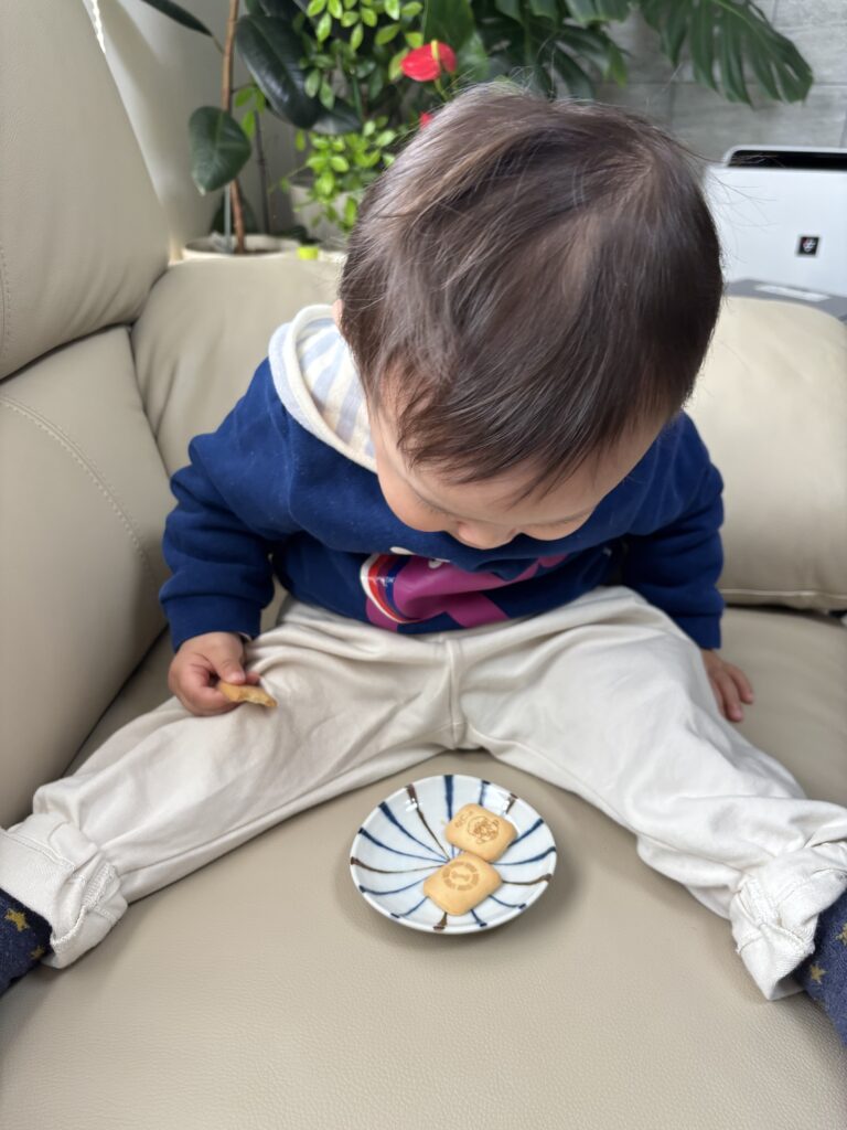 こちらは、初めてのクッキーです。お皿に乗せてるのに、置いているのはソファーの上だったのでちょっと笑っちゃいましたよ!